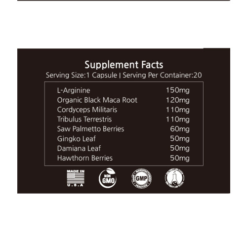 Tribulus Terrestris (남가새), Damiana Leaf (다미아나). Gingko Leaf (은행잎 추출물), Hawthorn Berries (산사나무 열매), Saw Palmetto (쏘팔메토)